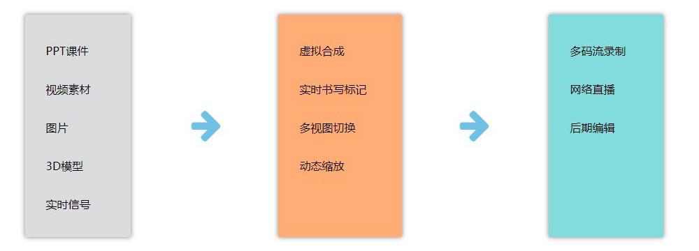 ● 融合了老师实时标注的PPT将作为背景信号,摄像机作为前景信号传到虚拟抠像机中,完成前景与背景的合成